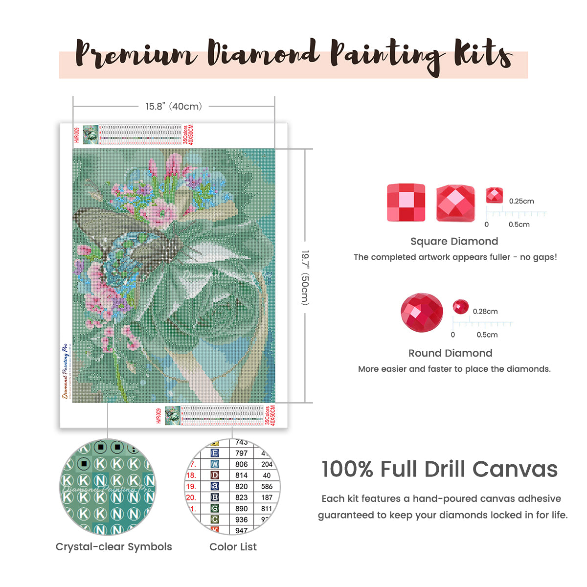 Full Drill Canvas (15.8"x19.7" / 40x50cm): Immerse yourself in the full diamond painting experience with the perfect canvas size for detailed masterpieces. Crafted with care using premium HD quality tarpaulin canvas, it's durable, waterproof, moisture-proof, and wrinkle-free, ensuring a stress-free painting process. Crystal-clear symbols provide easy guidance, while poured-glue canvas adhesive secures your diamonds, maintaining pattern visibility with the transparent cover.