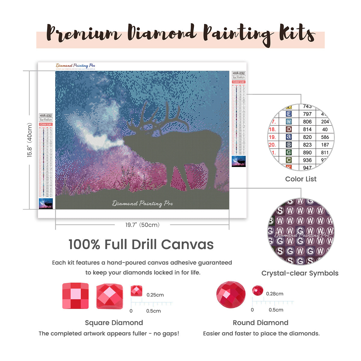 Full Drill Canvas (15.8"x19.7" / 40x50cm): Immerse yourself in the full diamond painting experience with the perfect canvas size for detailed masterpieces. Crafted with care using premium HD quality tarpaulin canvas, it's durable, waterproof, moisture-proof, and wrinkle-free, ensuring a stress-free painting process. Crystal-clear symbols provide easy guidance, while poured-glue canvas adhesive secures your diamonds, maintaining pattern visibility with the transparent cover.