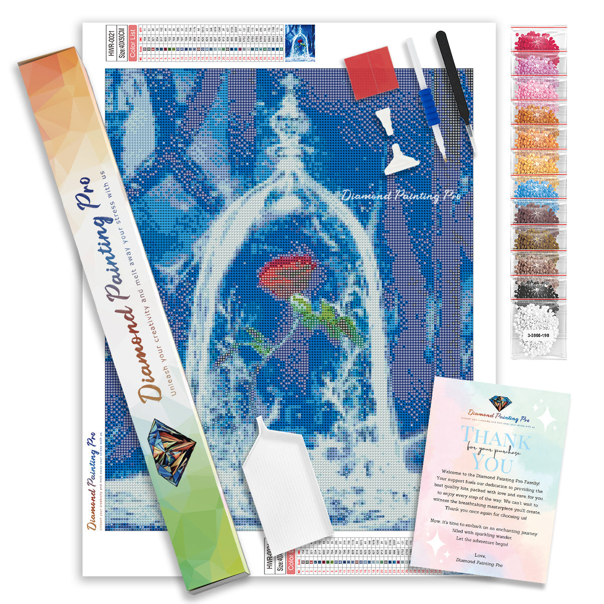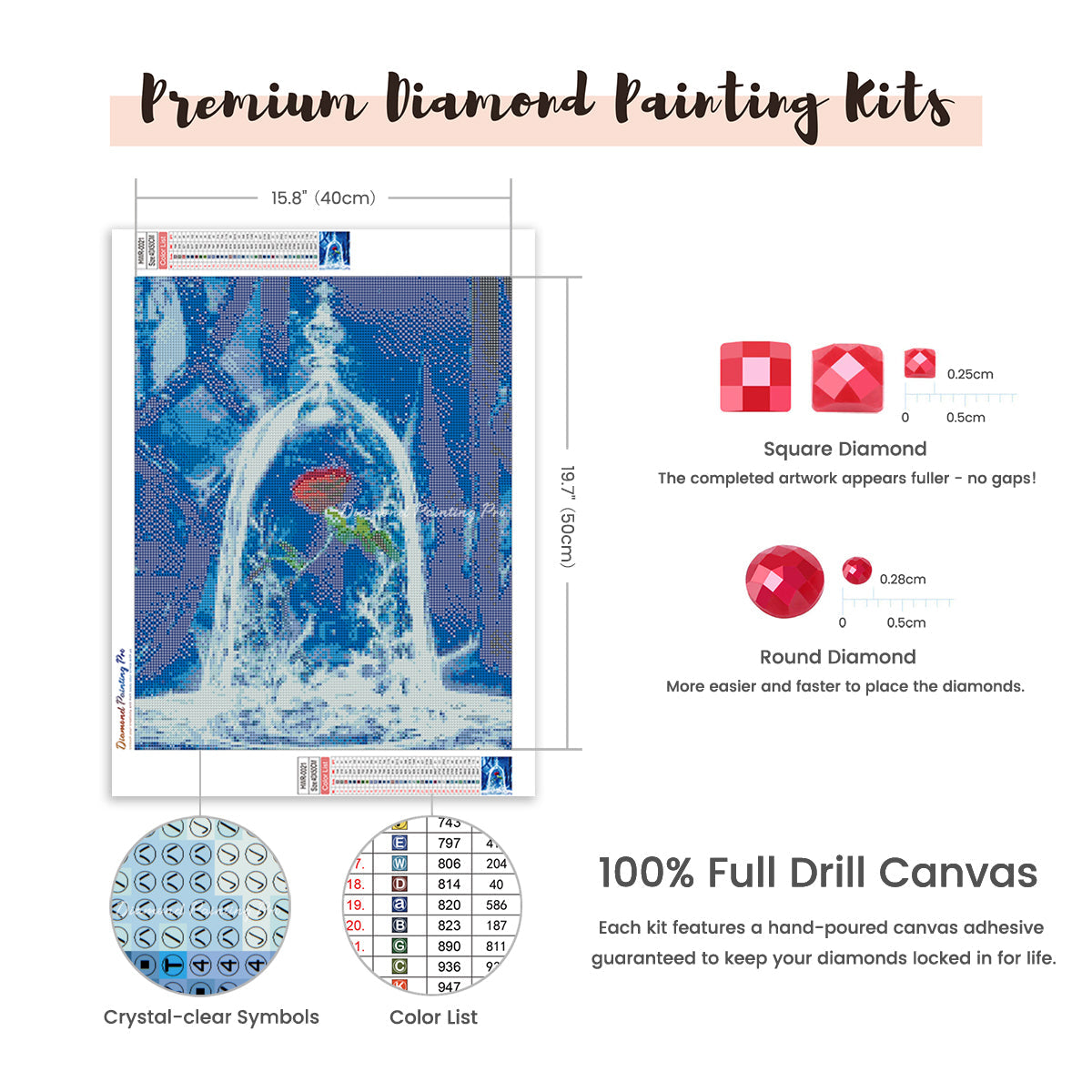 Full Drill Canvas (15.8"x19.7" / 40x50cm): Immerse yourself in the full diamond painting experience with the perfect canvas size for detailed masterpieces. Crafted with care using premium HD quality tarpaulin canvas, it's durable, waterproof, moisture-proof, and wrinkle-free, ensuring a stress-free painting process. Crystal-clear symbols provide easy guidance, while poured-glue canvas adhesive secures your diamonds, maintaining pattern visibility with the transparent cover.