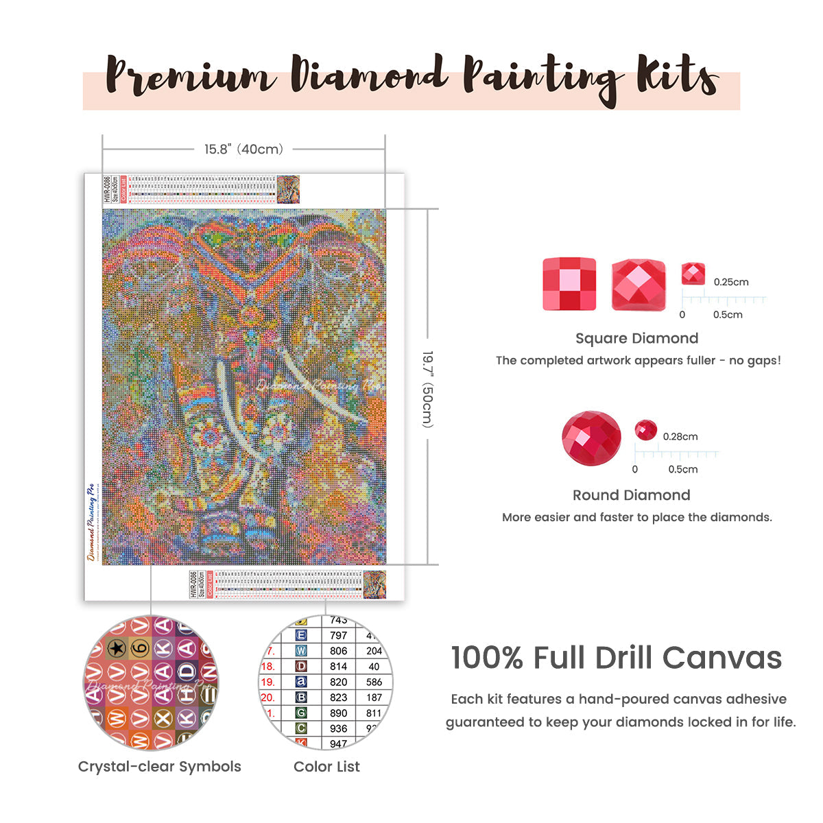 Full Drill Canvas (15.8"x19.7" / 40x50cm): Immerse yourself in the full diamond painting experience with the perfect canvas size for detailed masterpieces. Crafted with care using premium HD quality tarpaulin canvas, it's durable, waterproof, moisture-proof, and wrinkle-free, ensuring a stress-free painting process. Crystal-clear symbols provide easy guidance, while poured-glue canvas adhesive secures your diamonds, maintaining pattern visibility with the transparent cover.