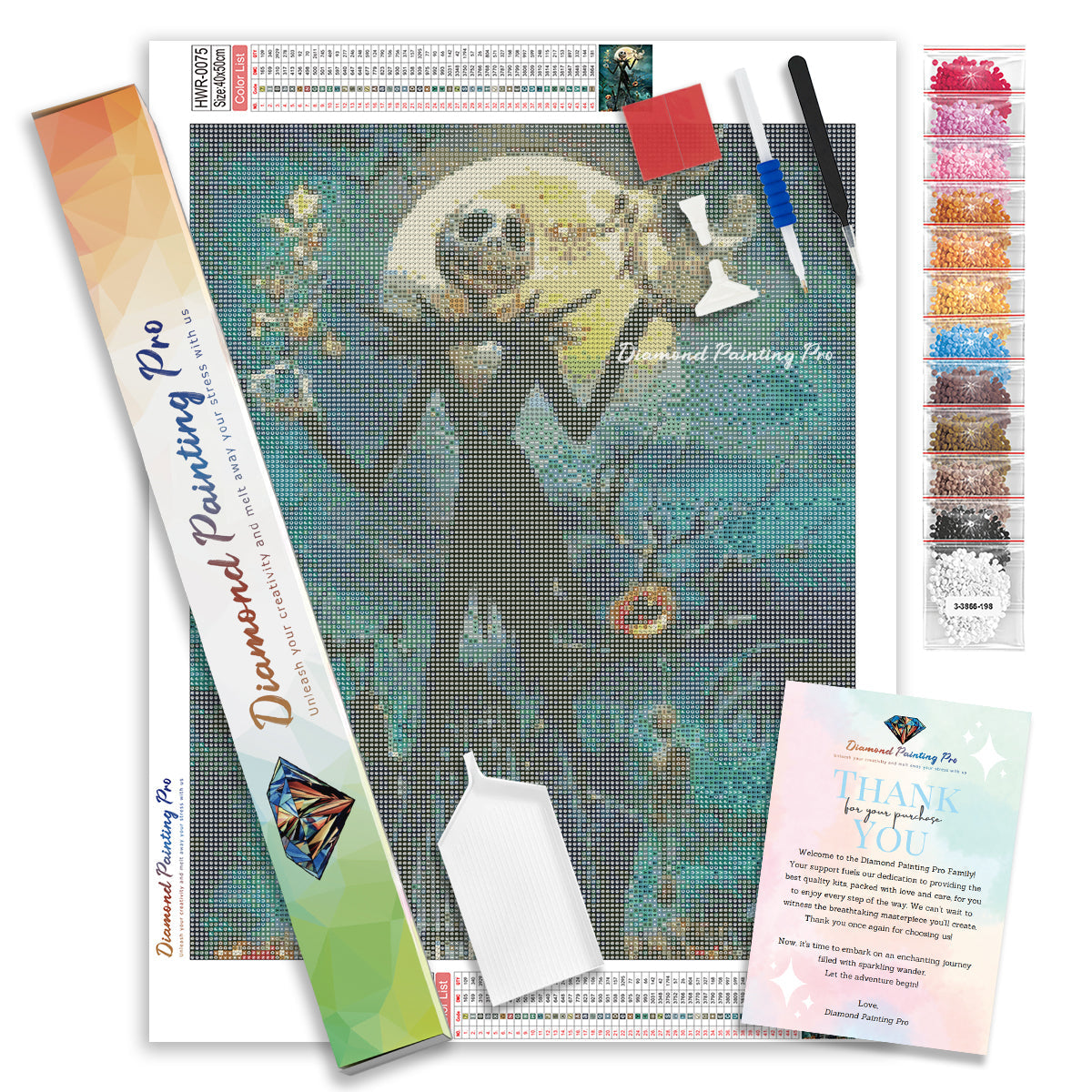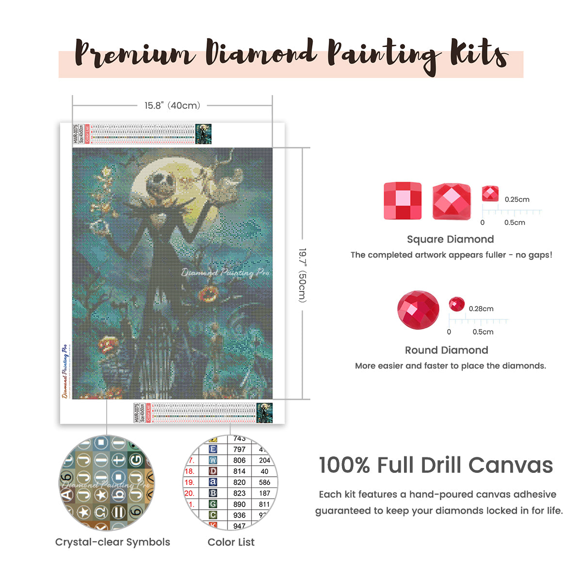 Full Drill Canvas (15.8"x19.7" / 40x50cm): Immerse yourself in the full diamond painting experience with the perfect canvas size for detailed masterpieces. Crafted with care using premium HD quality tarpaulin canvas, it's durable, waterproof, moisture-proof, and wrinkle-free, ensuring a stress-free painting process. Crystal-clear symbols provide easy guidance, while poured-glue canvas adhesive secures your diamonds, maintaining pattern visibility with the transparent cover.