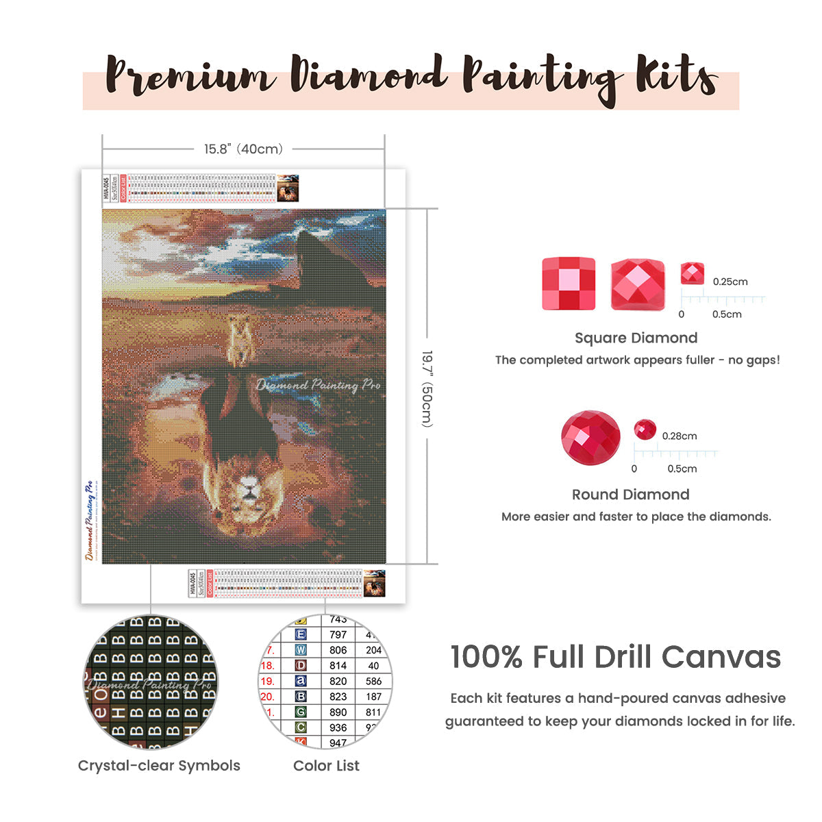 Full Drill Canvas (15.8"x19.7" / 40x50cm): Immerse yourself in the full diamond painting experience with the perfect canvas size for detailed masterpieces. Crafted with care using premium HD quality tarpaulin canvas, it's durable, waterproof, moisture-proof, and wrinkle-free, ensuring a stress-free painting process. Crystal-clear symbols provide easy guidance, while poured-glue canvas adhesive secures your diamonds, maintaining pattern visibility with the transparent cover.