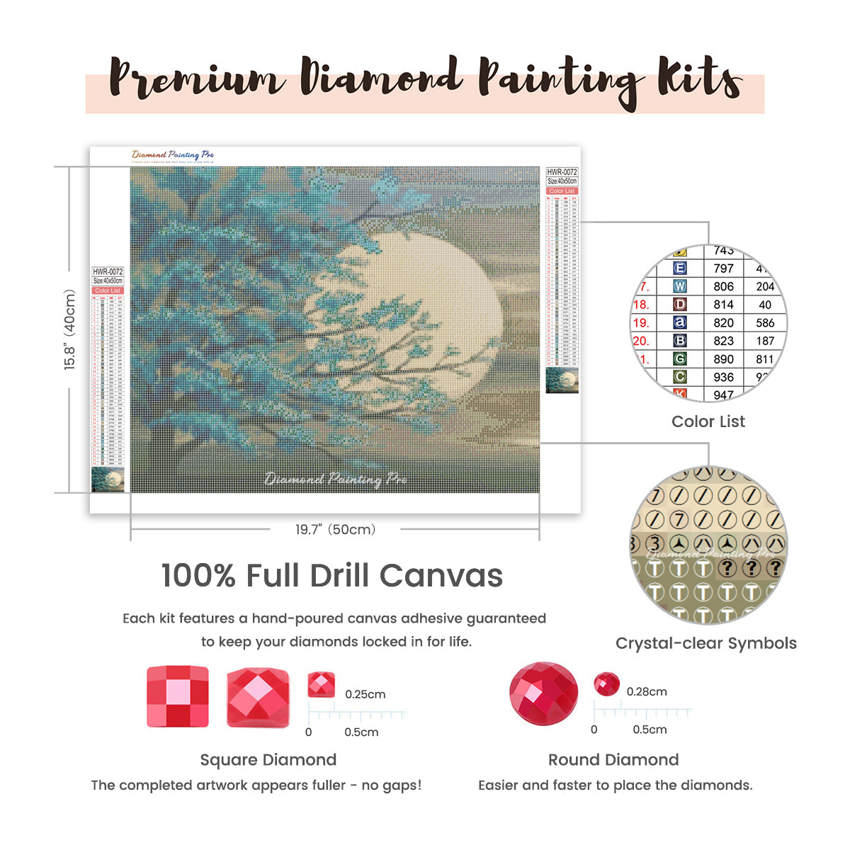 Full Drill Canvas (15.8"x19.7" / 40x50cm): Immerse yourself in the full diamond painting experience with the perfect canvas size for detailed masterpieces. Crafted with care using premium HD quality tarpaulin canvas, it's durable, waterproof, moisture-proof, and wrinkle-free, ensuring a stress-free painting process. Crystal-clear symbols provide easy guidance, while poured-glue canvas adhesive secures your diamonds, maintaining pattern visibility with the transparent cover.