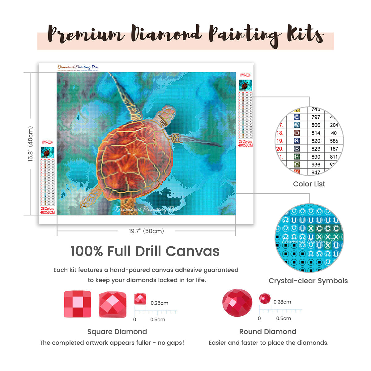 Full Drill Canvas (15.8"x19.7" / 40x50cm): Immerse yourself in the full diamond painting experience with the perfect canvas size for detailed masterpieces. Crafted with care using premium HD quality tarpaulin canvas, it's durable, waterproof, moisture-proof, and wrinkle-free, ensuring a stress-free painting process. Crystal-clear symbols provide easy guidance, while poured-glue canvas adhesive secures your diamonds, maintaining pattern visibility with the transparent cover.