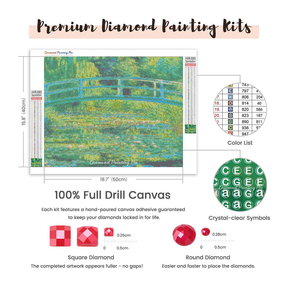 Full Drill Canvas (15.8"x19.7" / 40x50cm): Immerse yourself in the full diamond painting experience with the perfect canvas size for detailed masterpieces. Crafted with care using premium HD quality tarpaulin canvas, it's durable, waterproof, moisture-proof, and wrinkle-free, ensuring a stress-free painting process. Crystal-clear symbols provide easy guidance, while poured-glue canvas adhesive secures your diamonds, maintaining pattern visibility with the transparent cover.